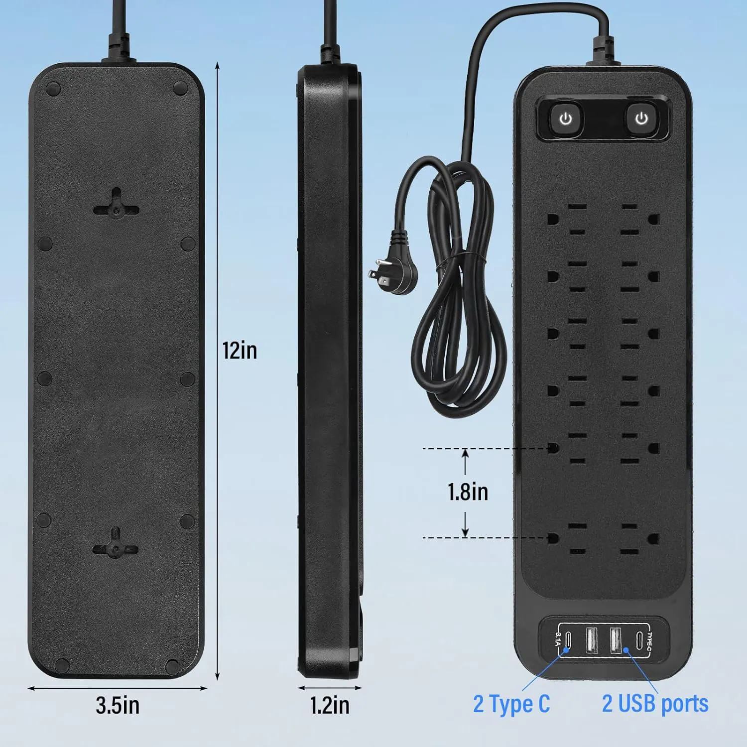 12 socket power board with 4 USB ports: The power board is equipped with 12 AC wide sockets, 4 USB charging ports, and two independent switches. The maximum output of each USB port is 5V/3.1A, which can power up to 12 devices simultaneously. Wide range voltage design, suitable for 110V to 125V circuits.