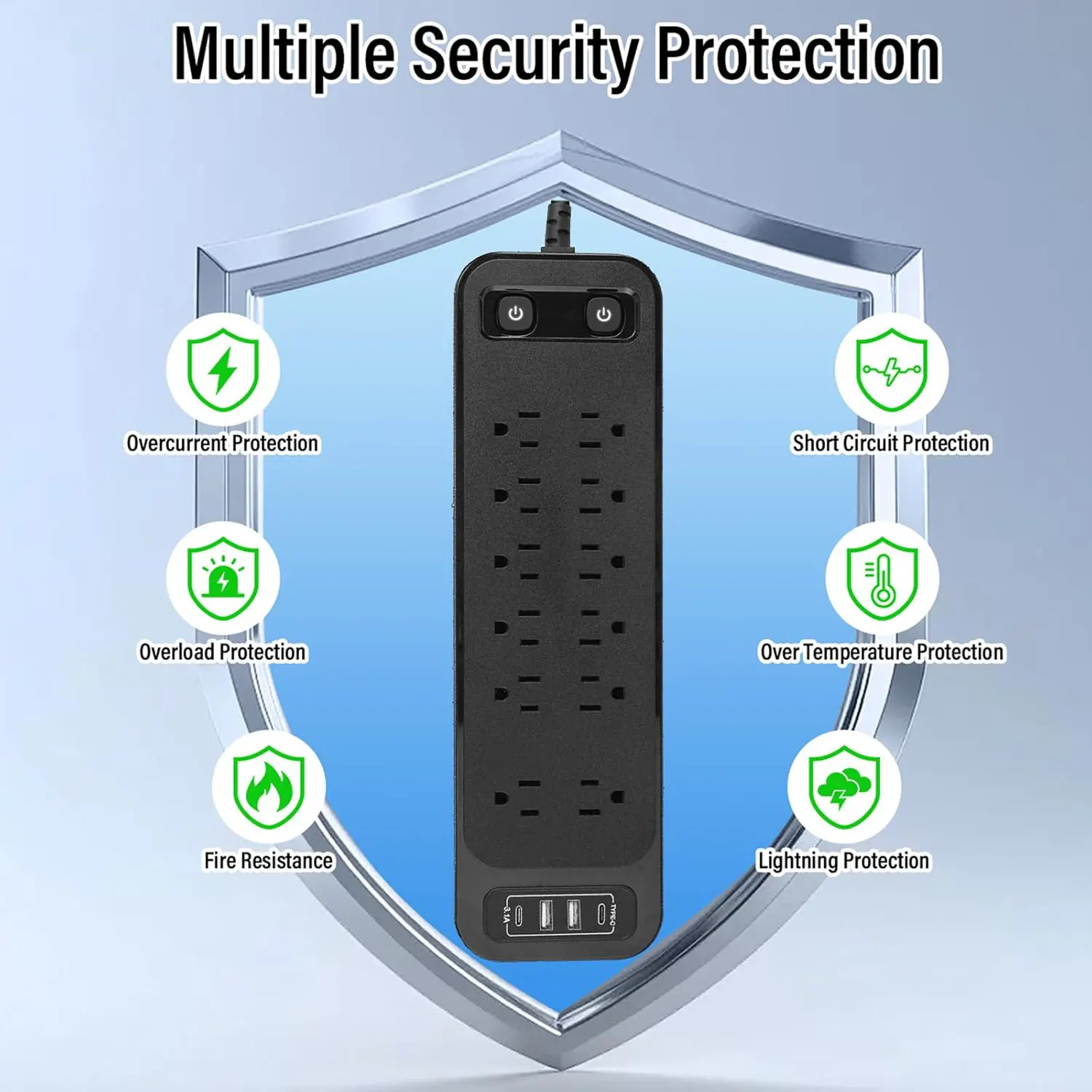 Overload surge protection: This power board has overload protection, short circuit protection, overcurrent protection, overvoltage protection, and overheating protection. Surge protectors with overload protection function can protect your appliances from lightning strikes, surges, or spikes.